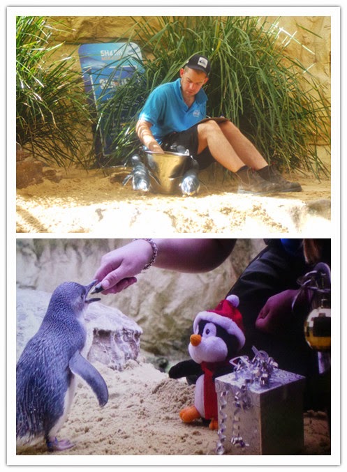 飼養員在餵食小企鵝,