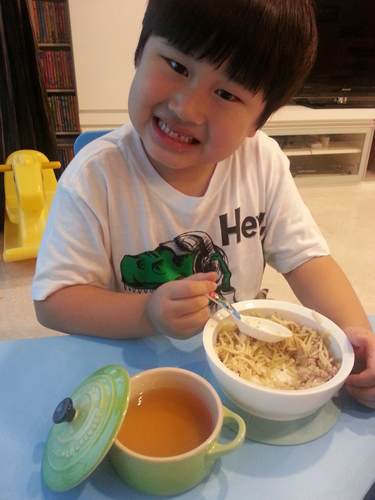他喝完還千叮嚀萬囑咐地跟我說明天還要用這個小綠碗裝湯給他喝呢!